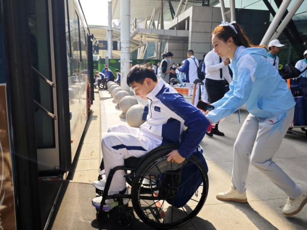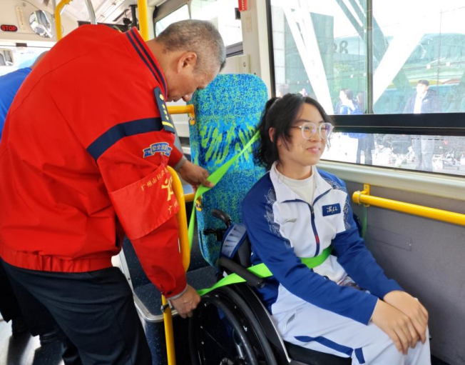 在工作人员和志愿者的引导下,轮椅运动员体验了从机舱门到大巴门的全程无缝衔接服务。志愿者们不仅细心推送每位运动员上车,还主动为他们系好安全带,让他们感受到如家人般的细致关怀。